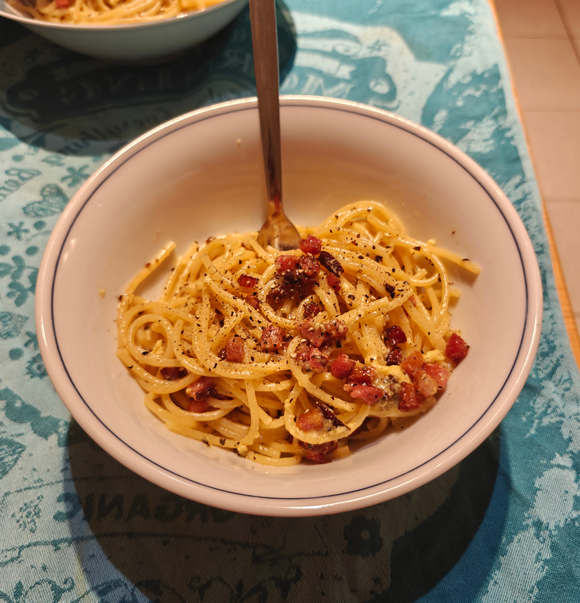 When the pasta is al dente, drain it, reserving a bit of the water. Add the pasta to the slightly crispy bacon, and turn off the heat. Carefully add the sauce and mix immediately. You need to be careful to not cook the eggs too much, make sure it has cooled a bit. Add a bit of the pasta water, and serve once the consistency is at the desired level.