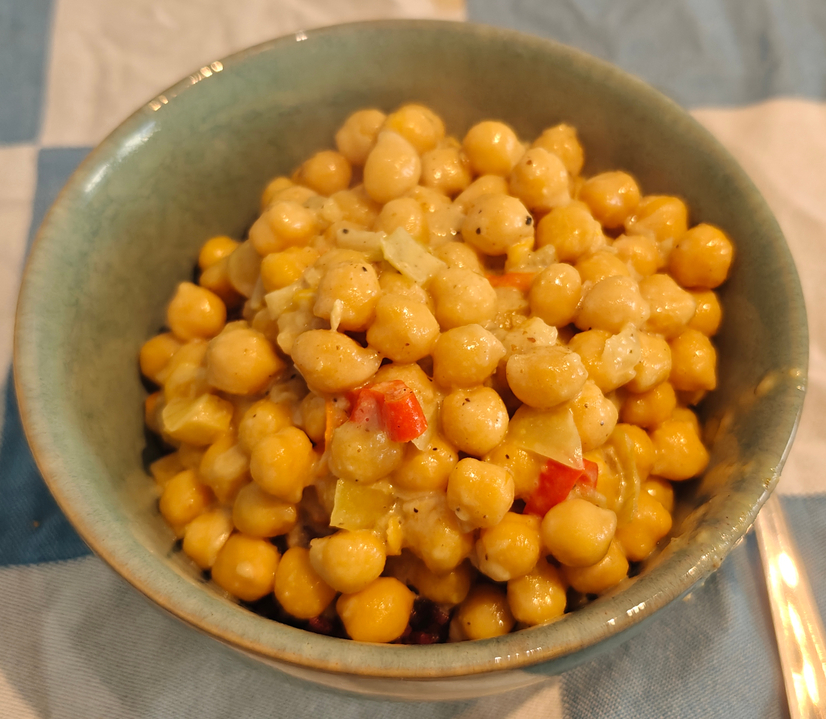 Add the chickpeas and water, but do not submerge everything. Adjust the salt, and add the whole mushroom.