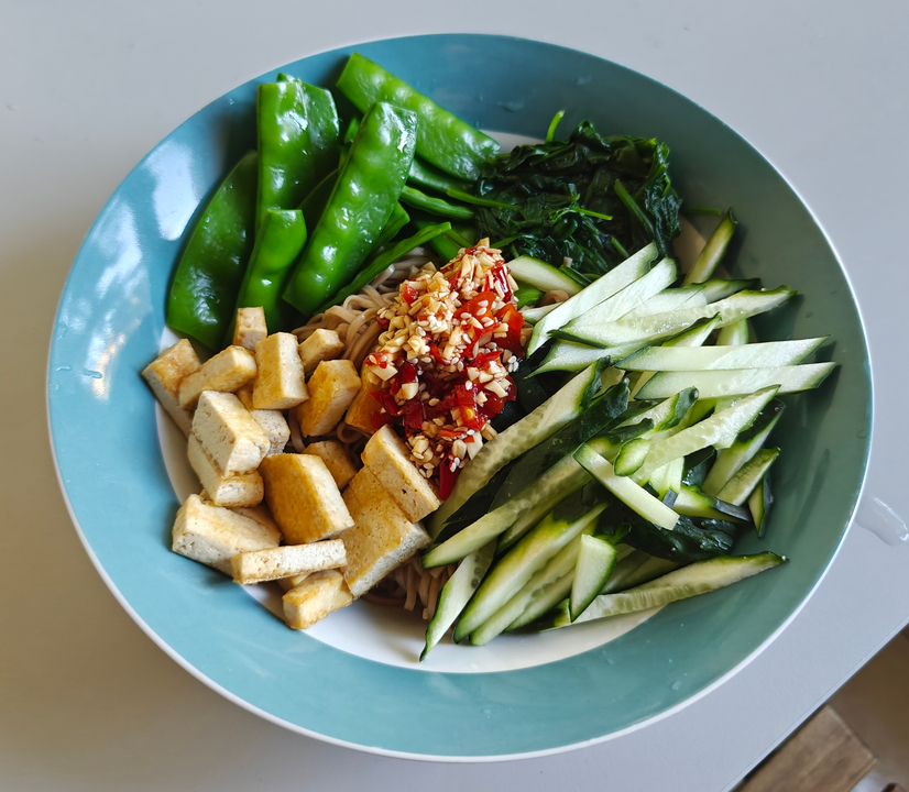 Assemble your bowl, place the soba, vegetables around, egg in the center, and drip the sauce on top. Enjoy your garlic breath afterwards.