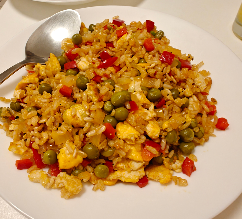 Add a bit more oil, a good one here is coconut oil, and fry the thinly chopped onion, and any other aromatics. When it starts to brown, toss in the rice and fry on high for a few minutes. Lower the heat and add any vegetable that needs cooking.