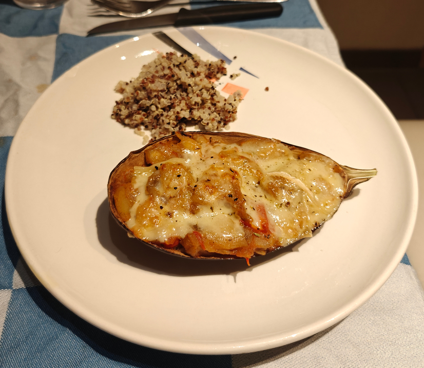 Slice the eggplant in half, and scoop out the interior. Bake the outside part in the oven at 180C for about 10 minutes. Thinly dice onions and fry in olive oil. After a few minutes, add the eggplant insides. After a few minutes, add the diced tomato, preferably without skin. Season with salt, black pepper, oregano. When everything is soft, smash the bigger pieces with the bottom of a glass, or use a mortar and pestle. Fill the eggplant with this paste, mixing it with some cheese. The top layer should be cheese, and garnished with more oregano. Bake until the cheese is browning.