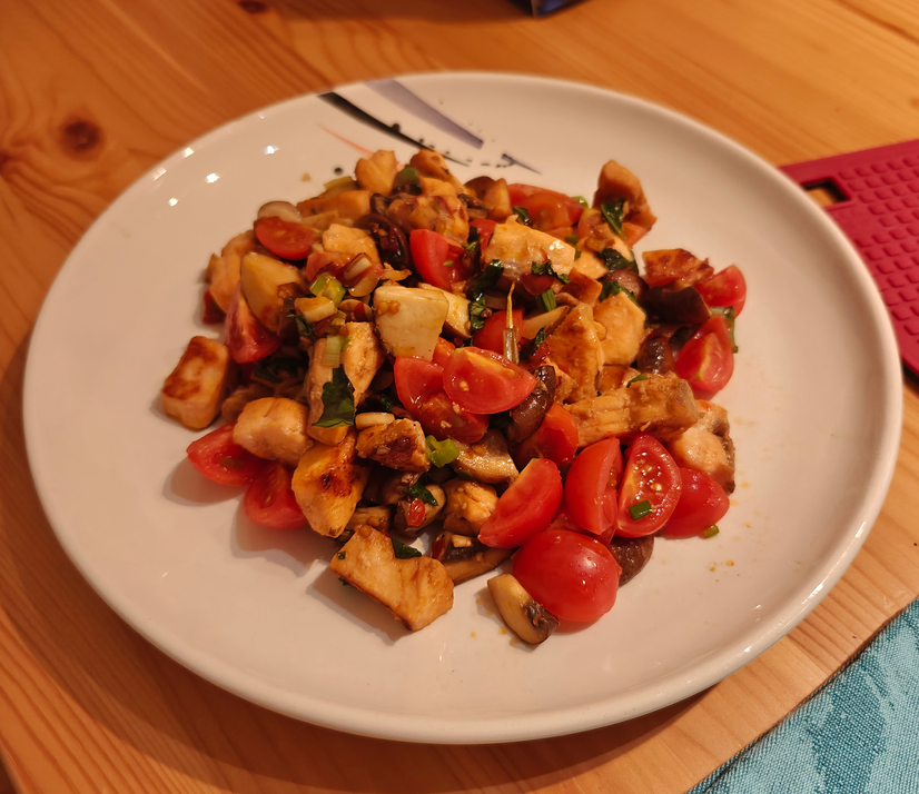 Cut the mushroom into cubes, then fry it (in the same oil) together with minced garlic, the white part of a green onion, and the chilli peppers.